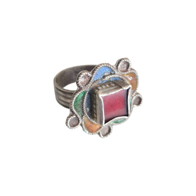 Vintage Berber Silver Enamel Talisman Ring: Moroccan Ethnic Jewelry