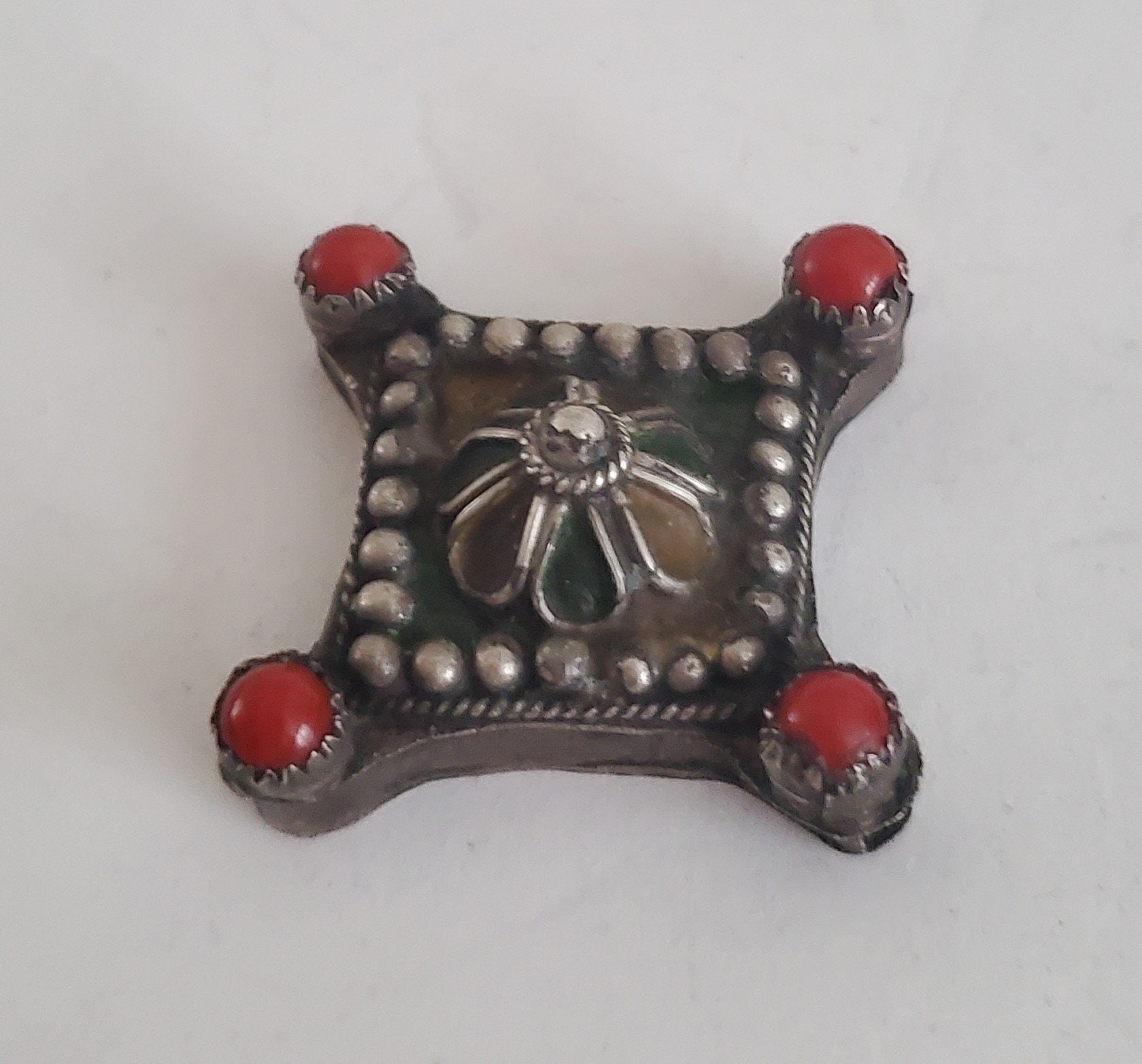 Old Berber enamel coral Pendant Silver from Southern Morocco Pendant Traditional Berber silver work, with nice quality enamel coral work THIS IS BEAUTIFUL!! ADD A CHAIN AND YOU WILL HAVE A BEAUTIFUL AND UNIQUE PIECE .. Hand of Fatima Pendant features detailed enamel wirework (see the photos) It is in good condition.