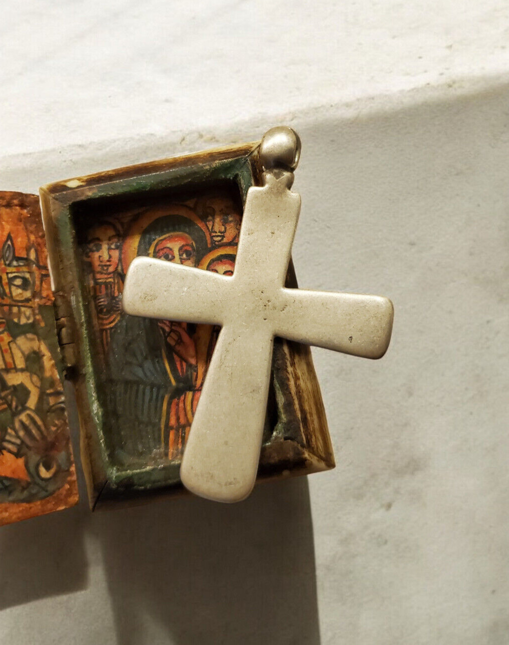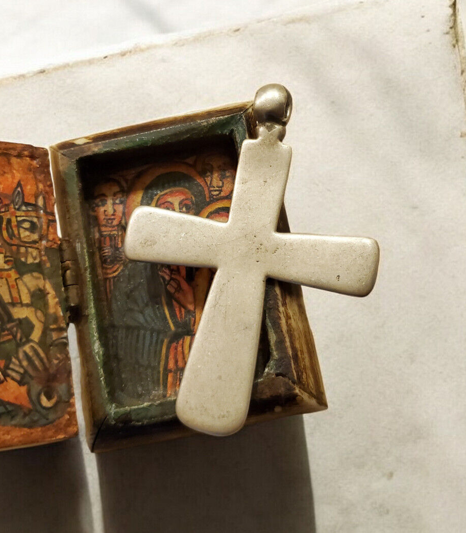 In Ethiopia particularly among Orthodox Church followers, to wear a cross implied to be protected by the lord himself as well as to show that they are a devoted Christian. Neck or pictorial crosses are tied round their owner’s neck with a piece of blue thread or cord, which was sometimes given to the wearer at baptism. This particular cross pendant is old and has been used.It is not marked but acid tested positive for 925 Silver