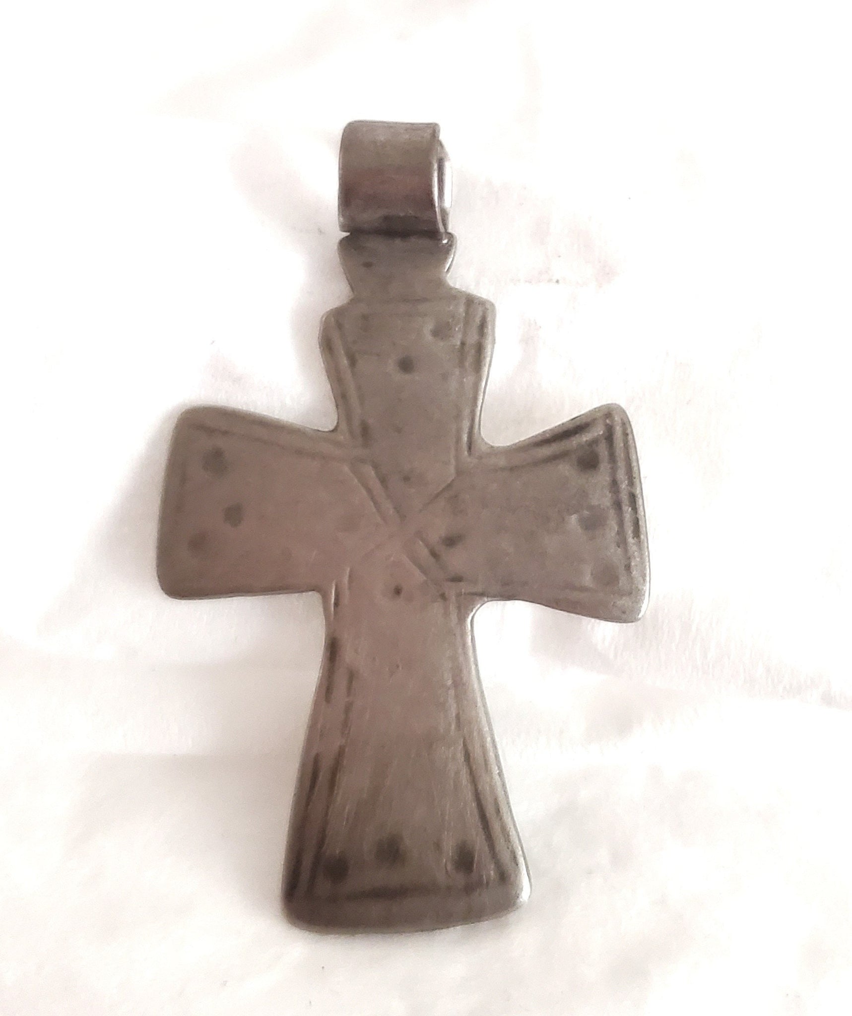 beautiful old handmade Ethiopian cross pendant made of silver . In Ethiopia particularly among Orthodox Church followers, to wear a cross implied to be protected by the lord himself as well as to show that they are a devoted Christian. Neck or pictorial crosses are tied round their owner’s neck with a piece of blue thread or cord, which was sometimes given to the wearer at baptism. This particular cross pendant is old and has been used. Measures approximatelty 1".5 x 2‘‘.5 long Age: over 100 great condition Collectible other shop .....africanbazaarus.com