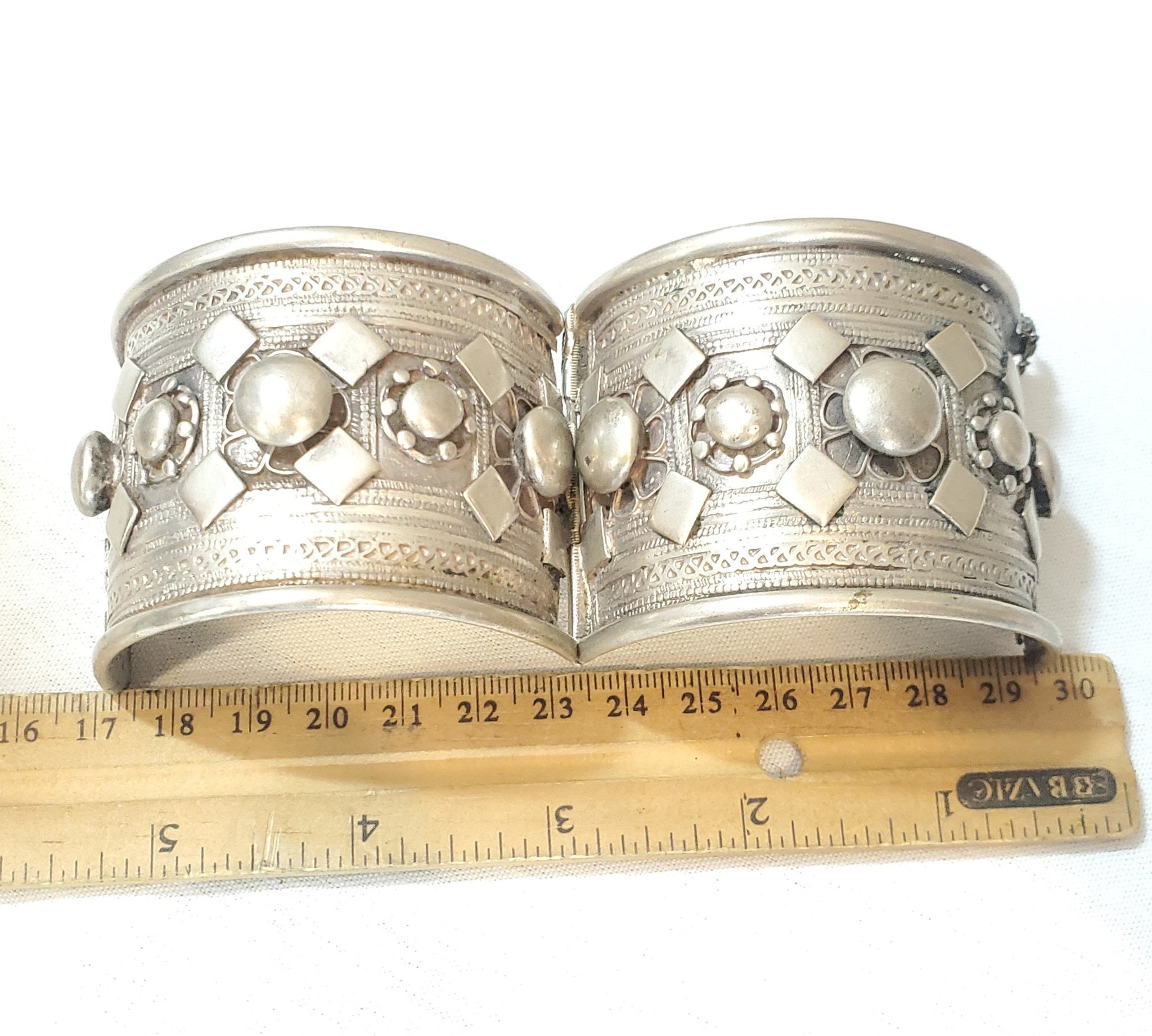 Antique Stunning, single Ethiopian Cuff made of 100 year old coin silver. well handmade piece, It closes easily and perfectly with pin closure high grade silver done by highly skilled silversmith really looks much better than the pictures is a heavy silver bracelet Beautifully detailed and decorated made of good silver Wonderful to wear or highly collectable. If you need more detailed photos please feel free to ask .Weight:140 Grams. Measures approximately Height: 2"5 Circumference: 8" Inner diameter: 2".5 with hinge and pin closure 2".5 long Age:From the first half of the 20th Century. The bracelet is in its original condition except for the aging and the wear, that gave the bracelet this wonderful patina. This beautiful piece of silver was created for a Ethiopian woman before the 1940s rare This piece can be purchased on a lay-away plan that works for you Contact me for more information.Thanks for your support and feel free to message with any questions!.......africanbazaarus.com