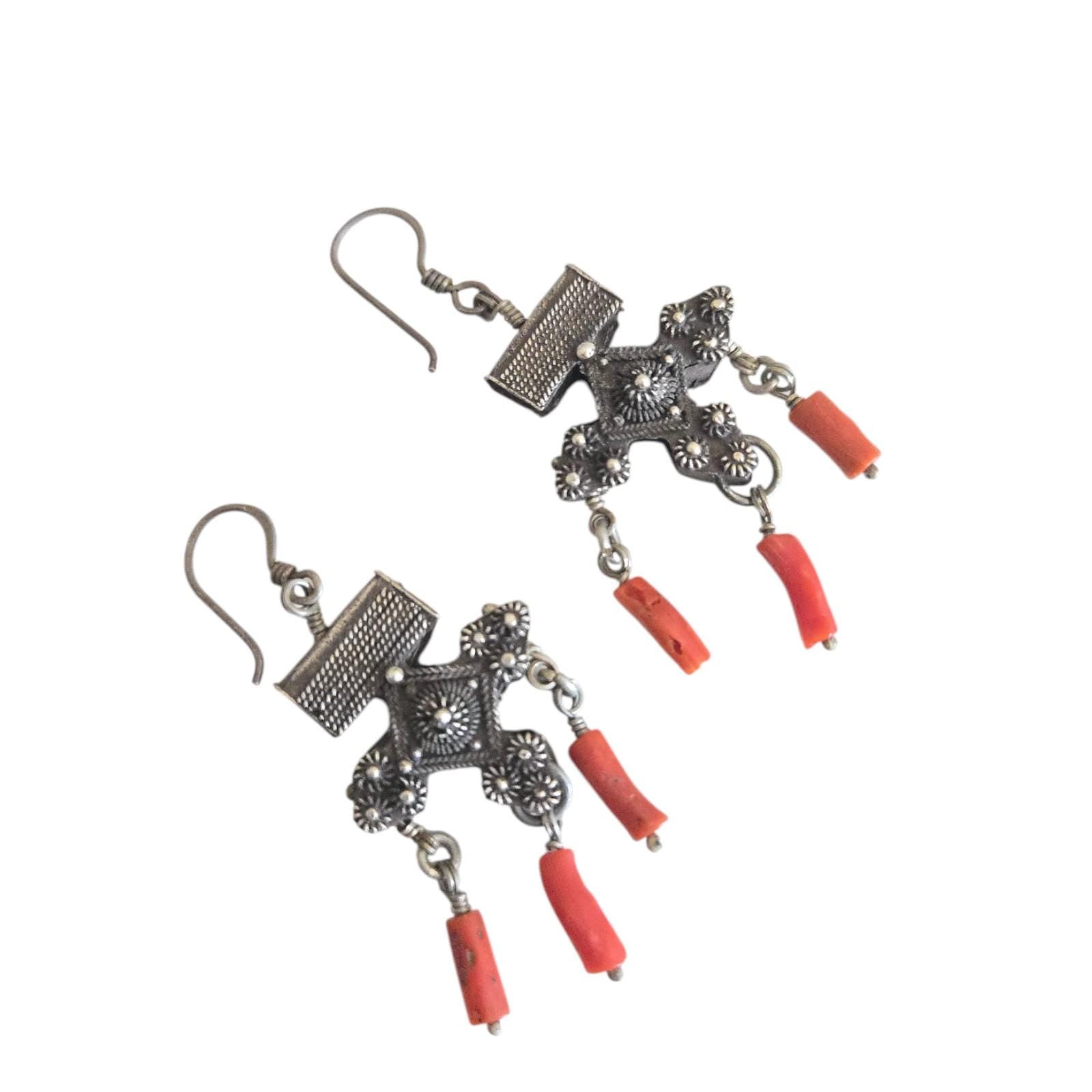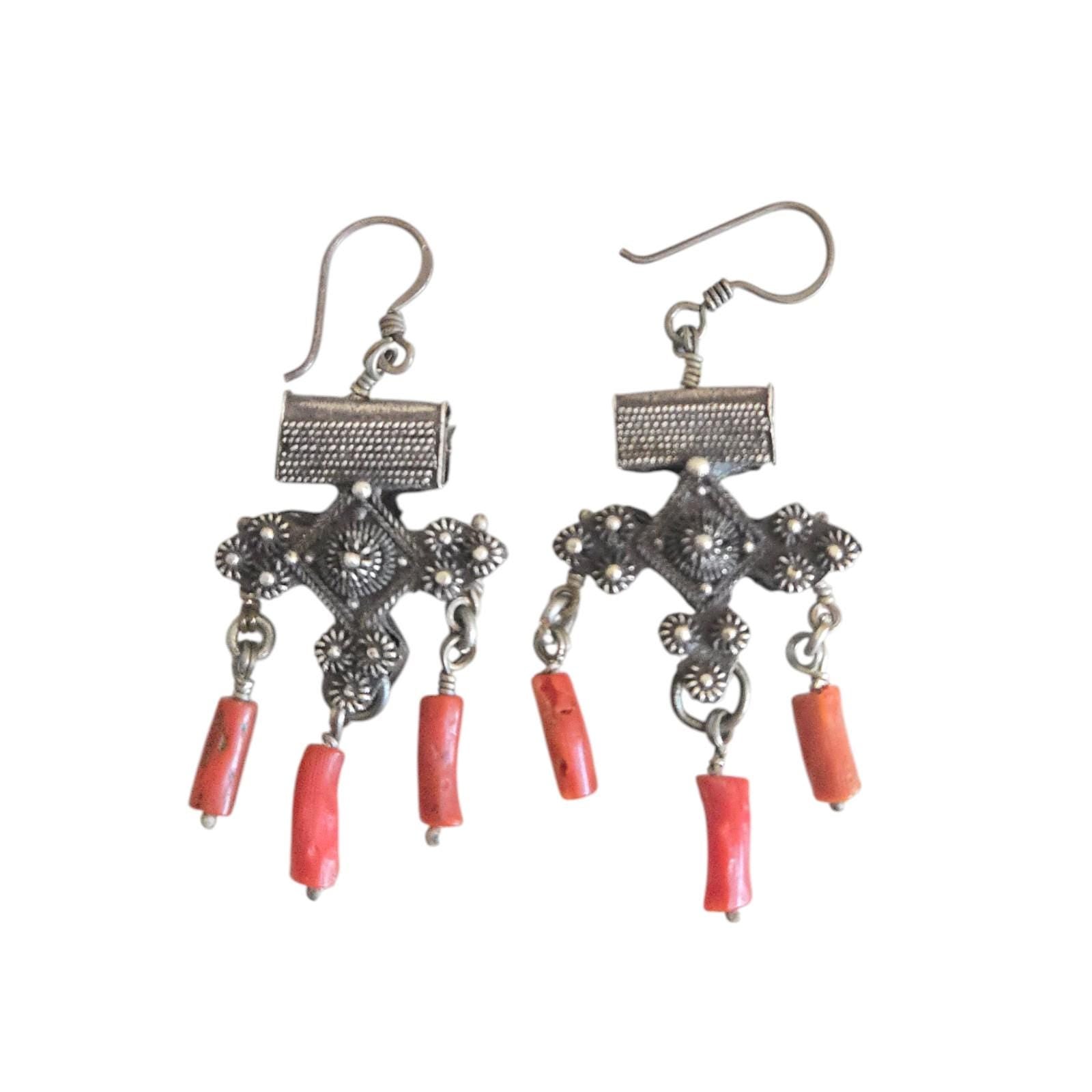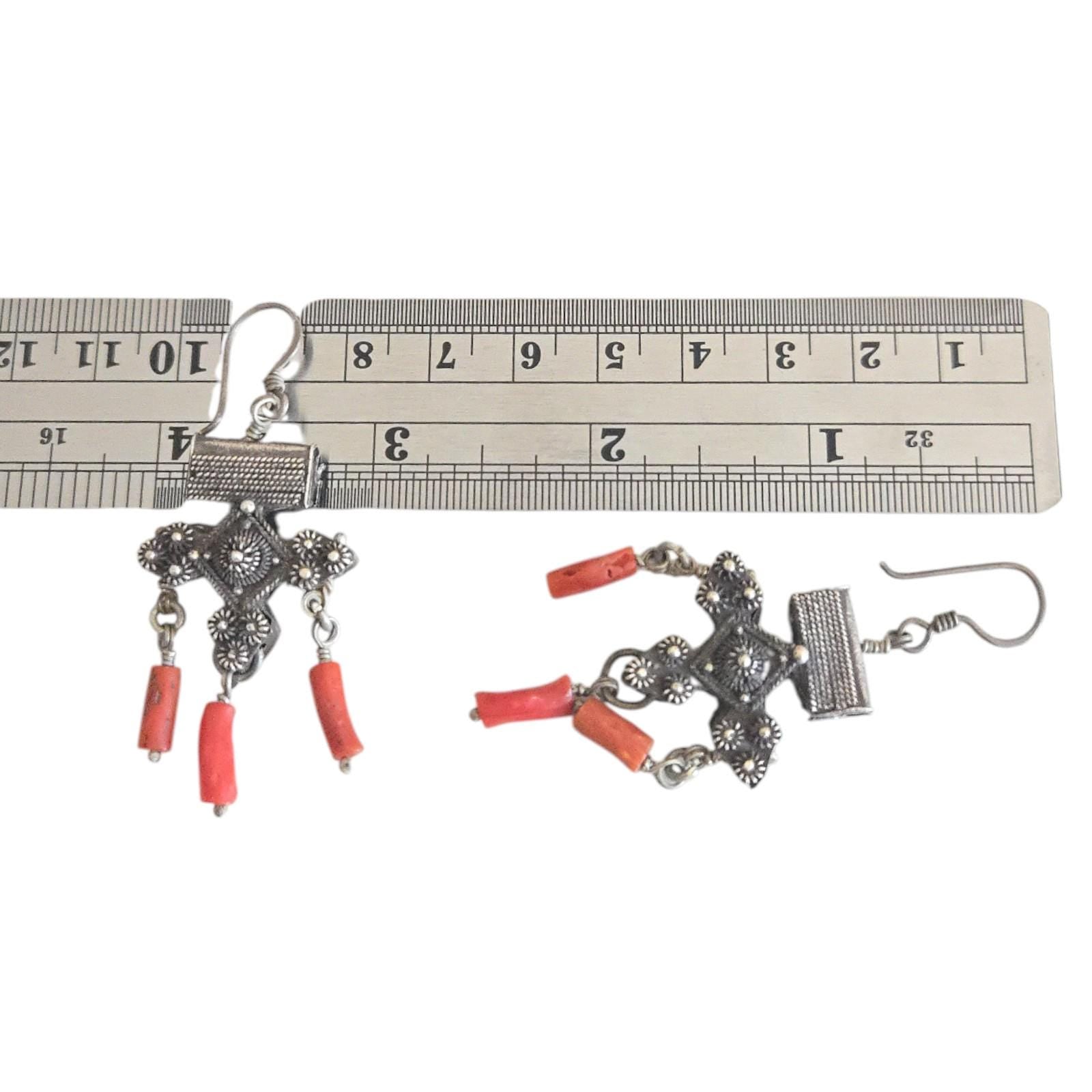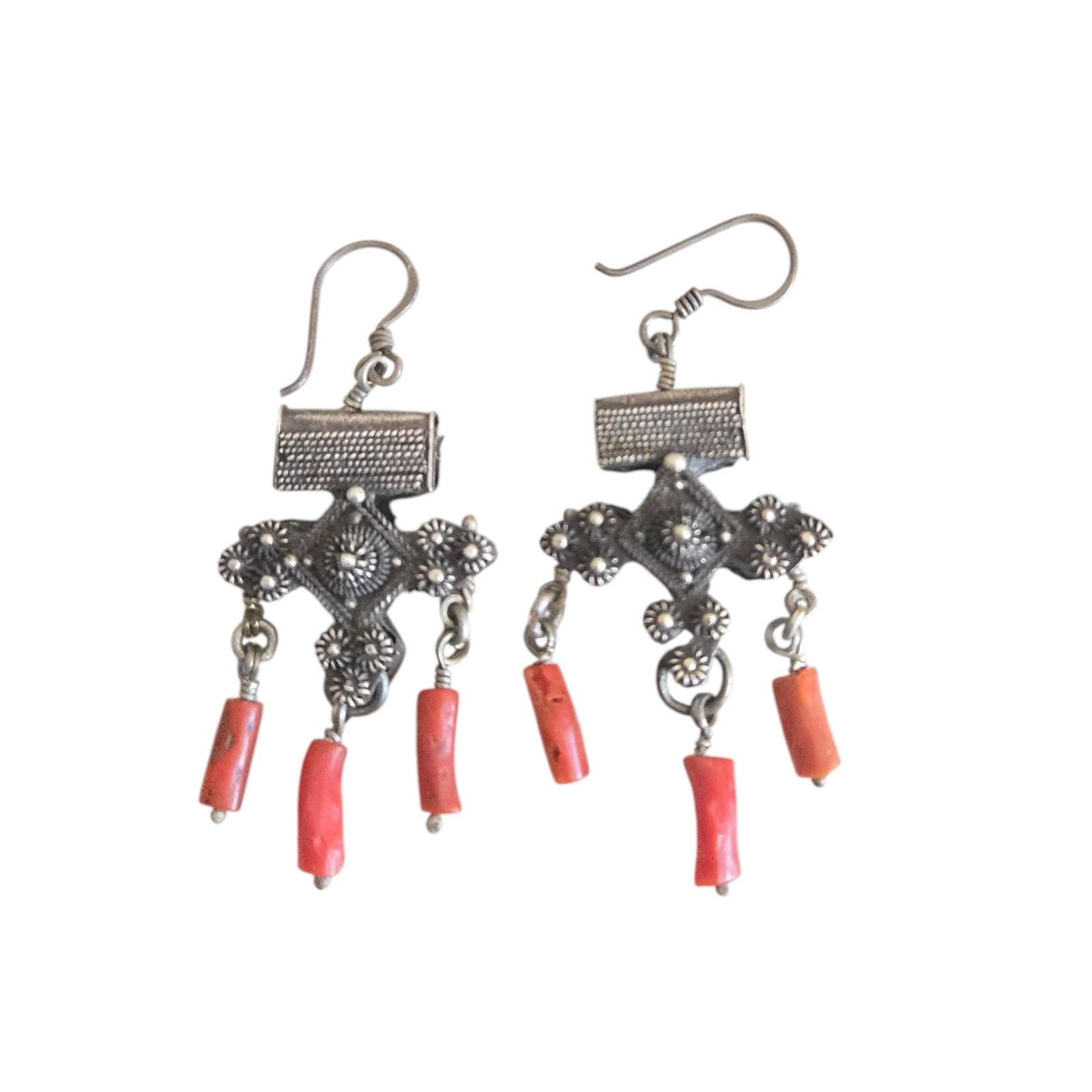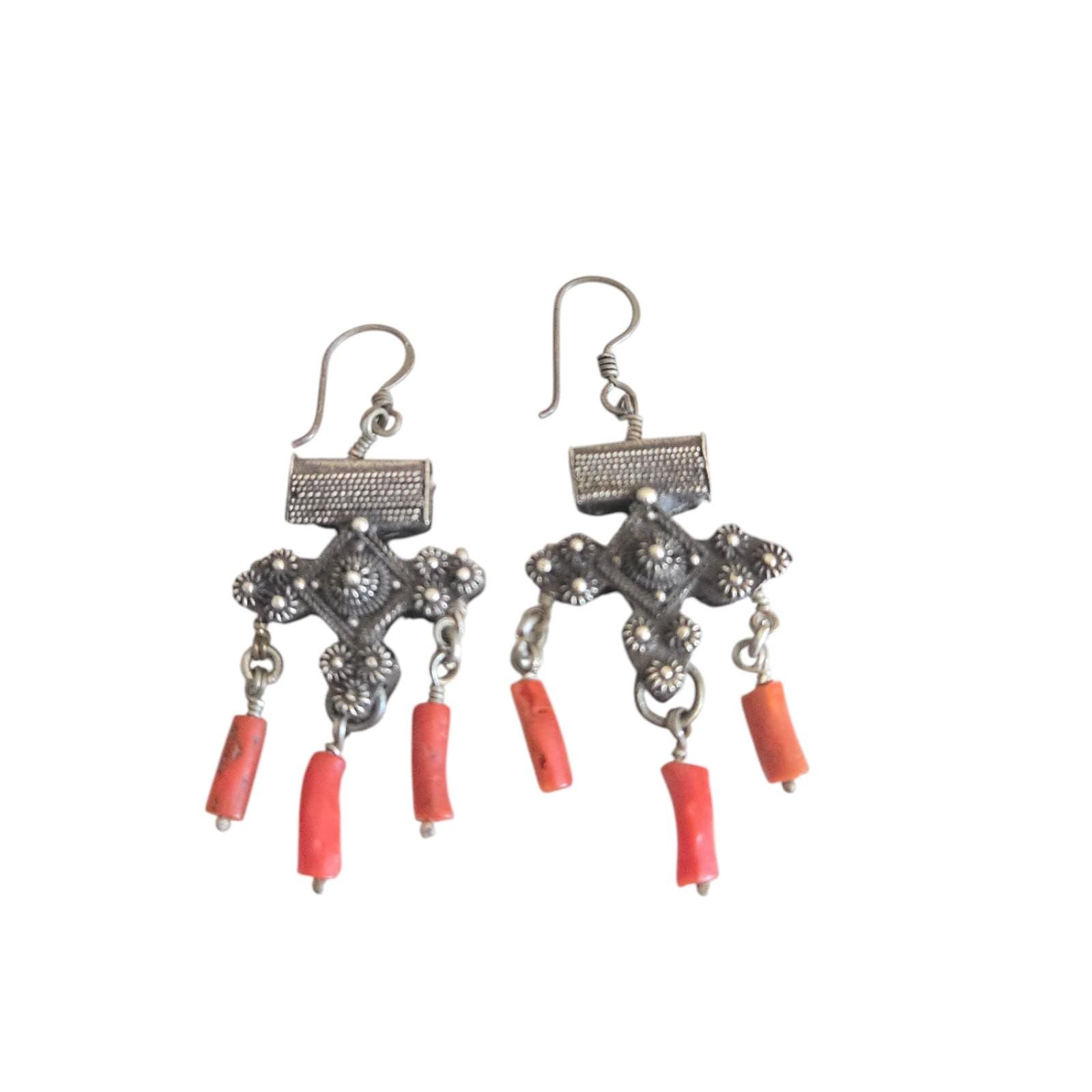 Antique coral Beads silver Earrings Ethnic Tribal small coral-made from the mid-1900s and old silver Moroccan Vintage Silver Earrings is a lovely Good condition This is a great authentic jewelry .Each earring measures just over 2‘‘.5 long and just under 1‘‘ wide./ 12.gr The workmanship is wonderful.These earrings were hand made sterling silver 925.......africanbazaarus.com