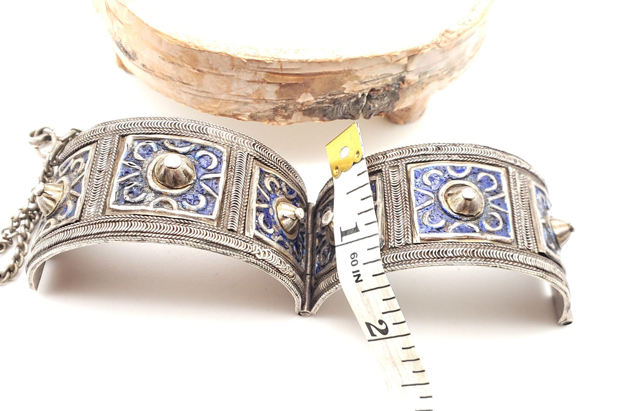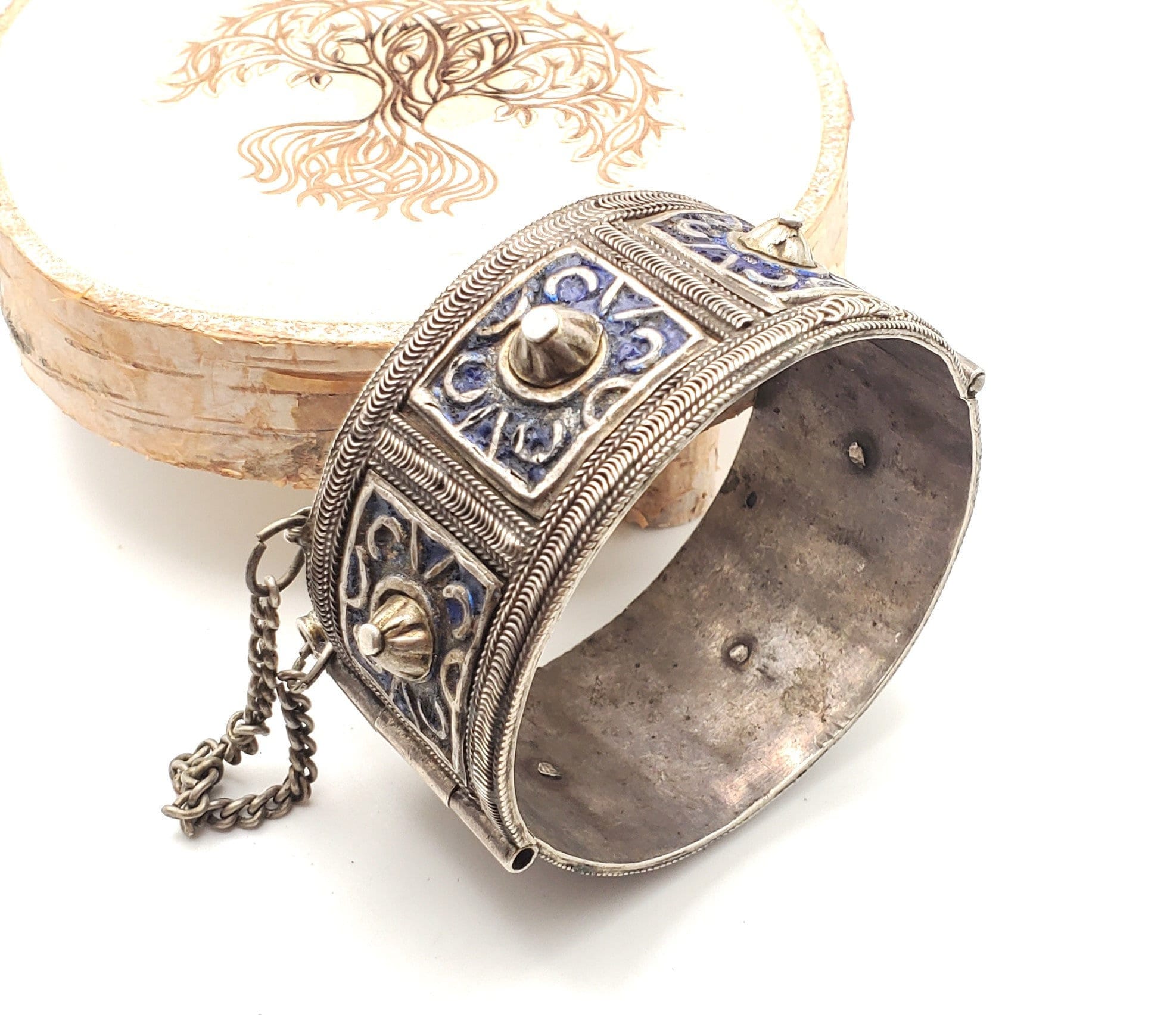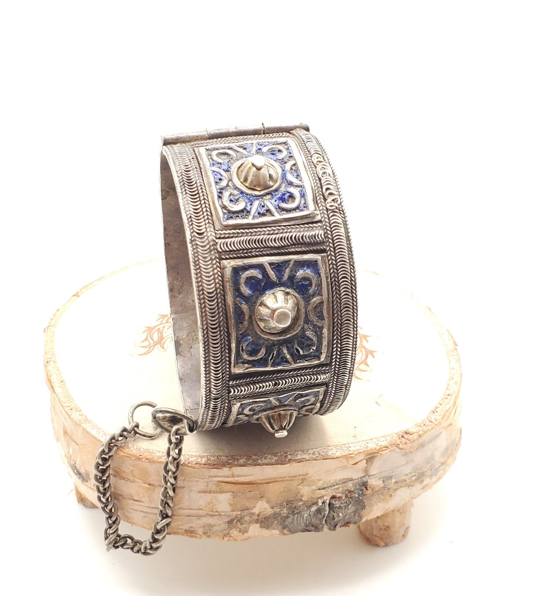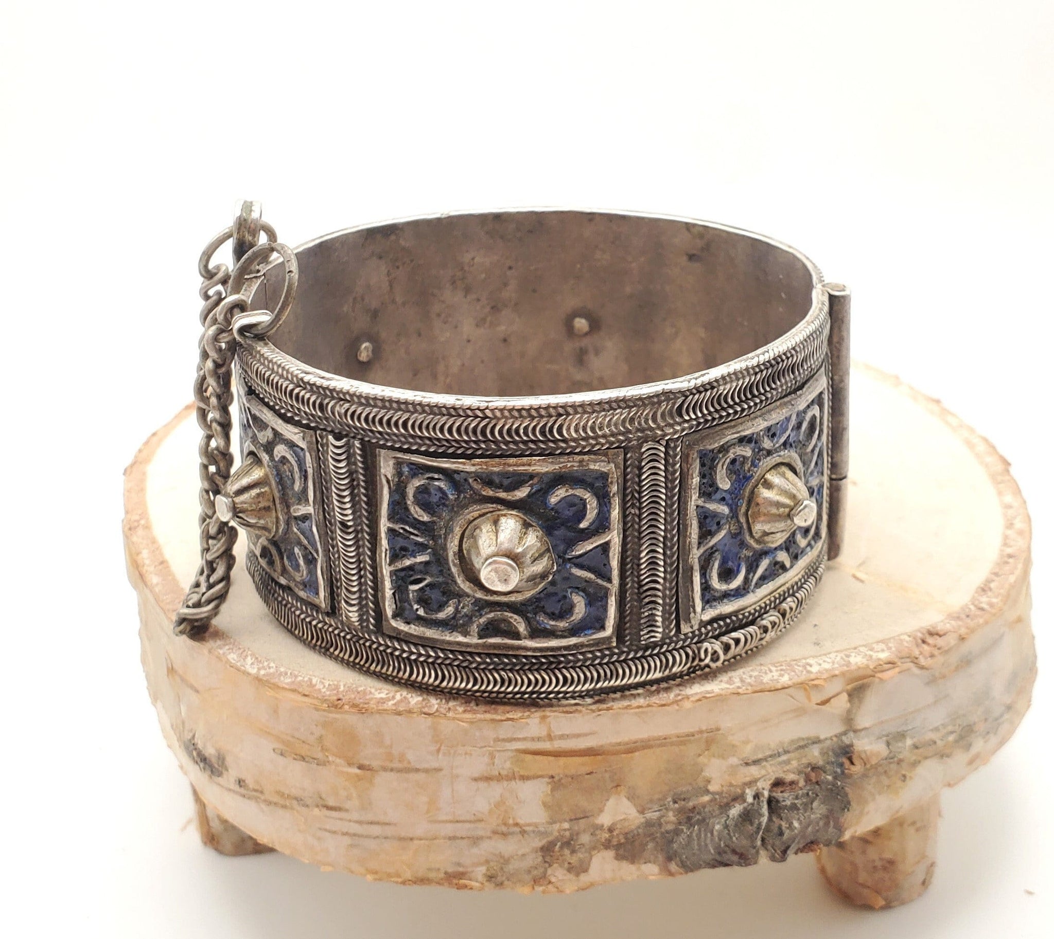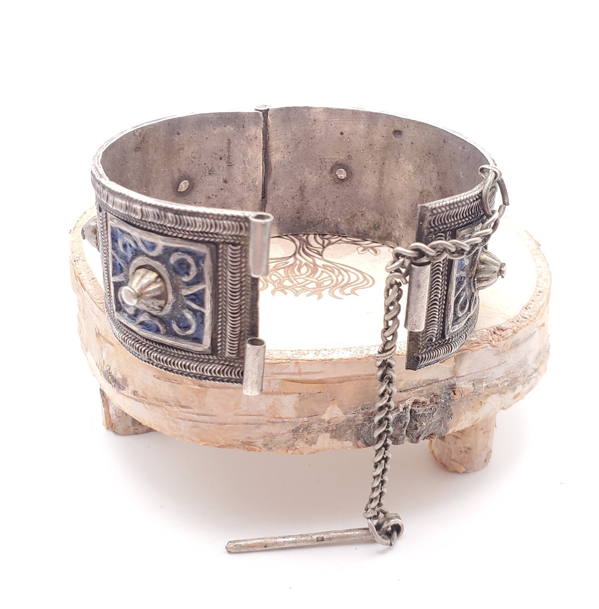 This antique silver bracelet is a unique piece of ethnic tribal Antique Silver Moroccan Berber enamel Bracelet from Berber Tiznit, Morocco etched and decorated with dark blue enamel and Nice hefty clasp with safety chain from the Early 19th century.