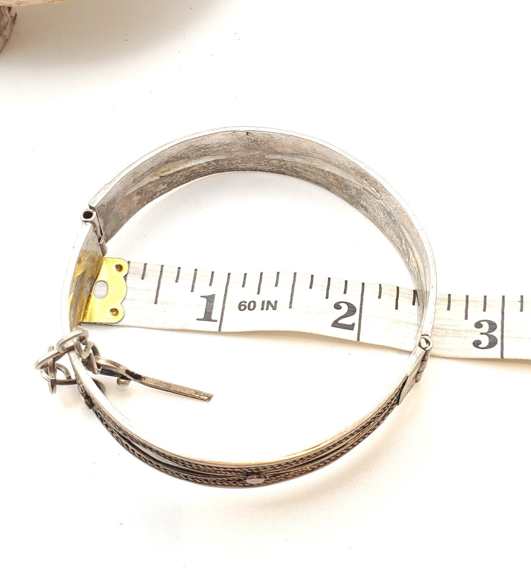 silver bracelet is a unique piece of Moroccan jewelry that showcases the intricate craftsmanship of the Berber tribe. traditional charm make it a timeless accessory that complements any outfit. The bracelet is made of fine sterling silver . This ethnic tribal bangle is a vintage item that is handmade in Morocco, making it an original and authentic piece of jewelry. Its features include ethnic, regional, and tribal themes, making it a perfect addition to any jewelry collection. This unisex bracelet is perfect for fashion enthusiasts who appreciate the beauty and elegance of antique jewelry. Measures just under 2‘‘.5 wide (at the widest) and has an inner diameter of just over 7‘‘x.22mm 40gr The bracelet is in excellent condition feature detailed wire-work high grade alloy of silver with wonderful wear