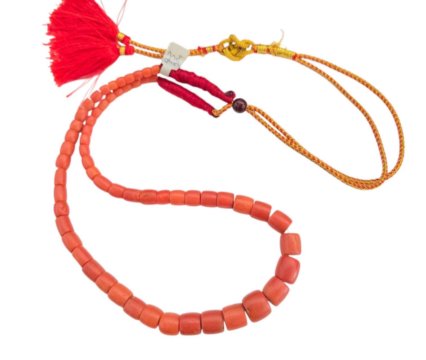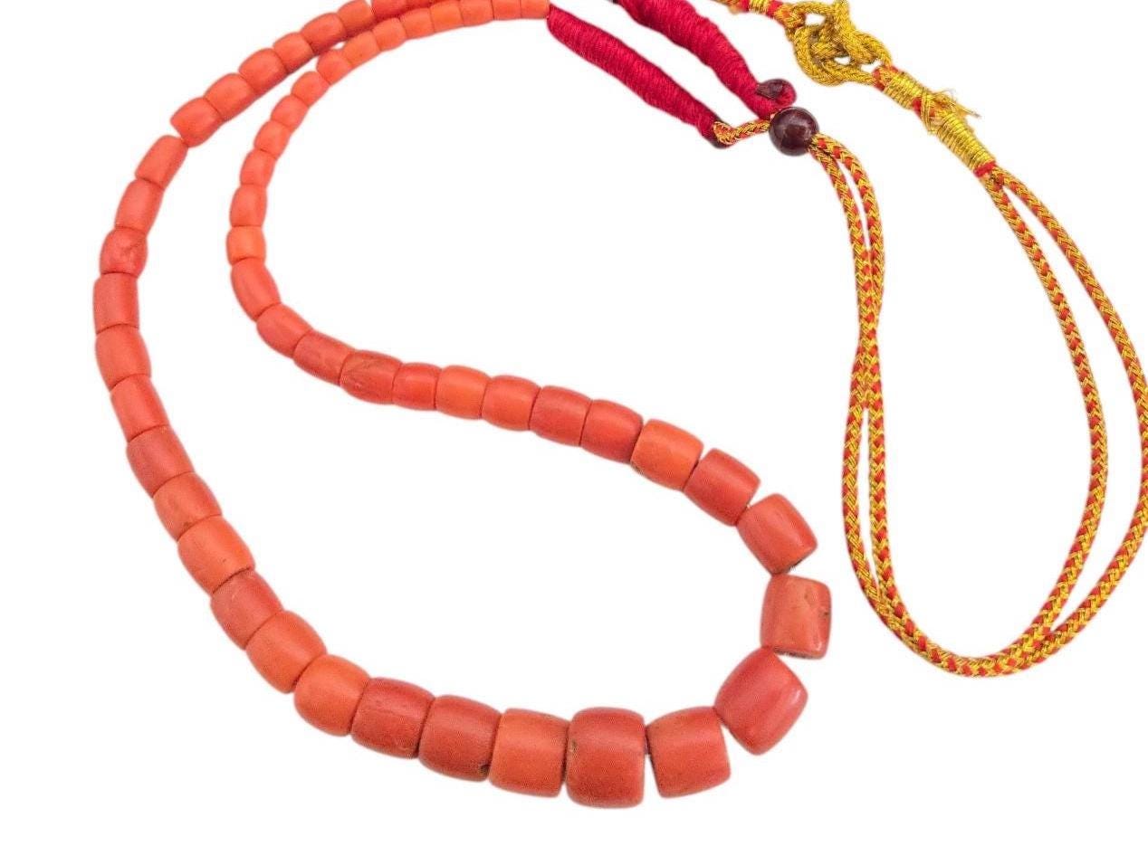 Antique Yemen natural Authentic Red Coral Beads necklace. Very old natural beads antique Red Coral Islamic Beads/Worry Beads from Yemen made in excellent condition. quality from first half of XX century The total length of the necklace is 18‘‘adjustable strain to 30‘‘ (see pictures). Collectible. Measures: a little over 6mm x 10mm Good condition 43 grams .