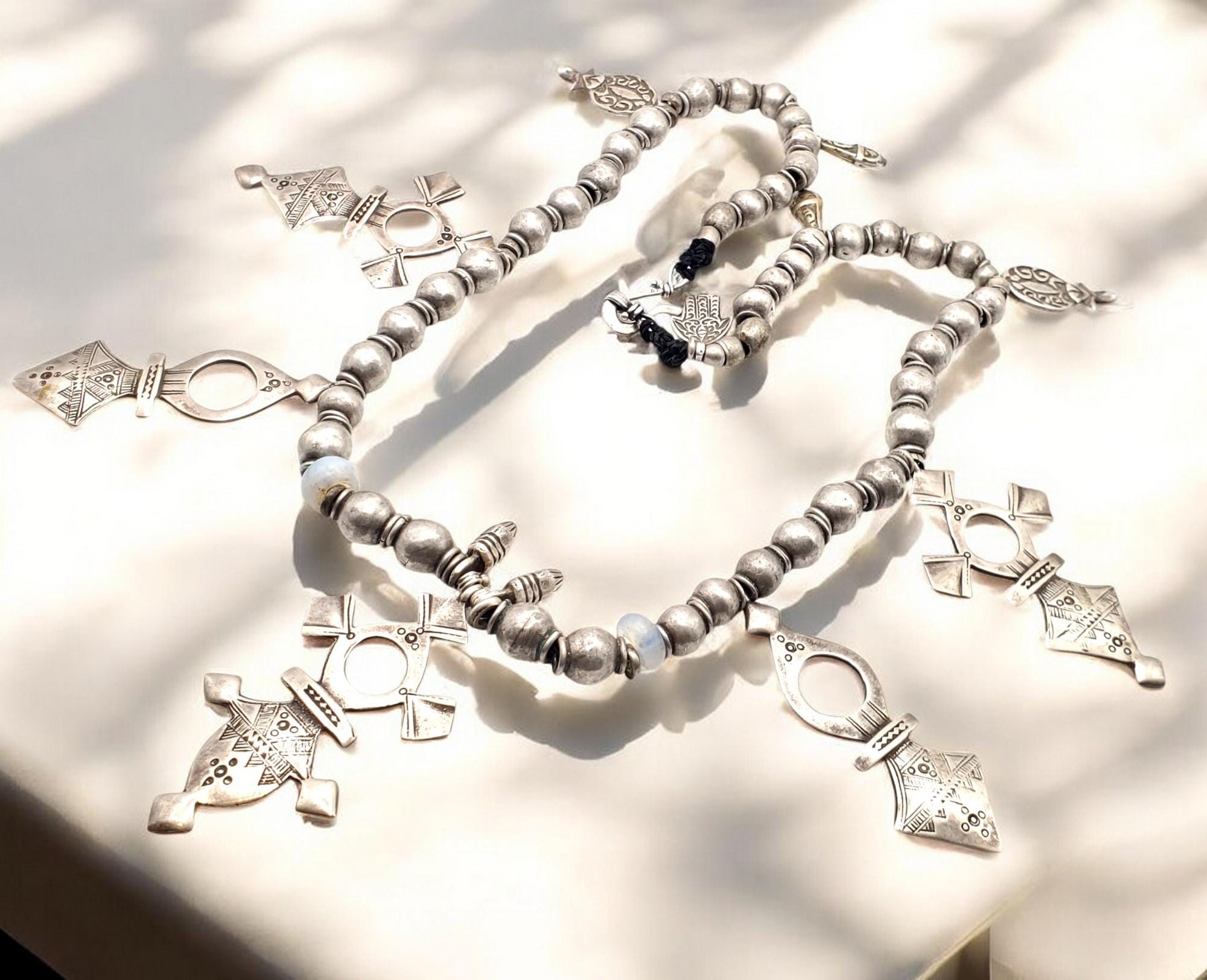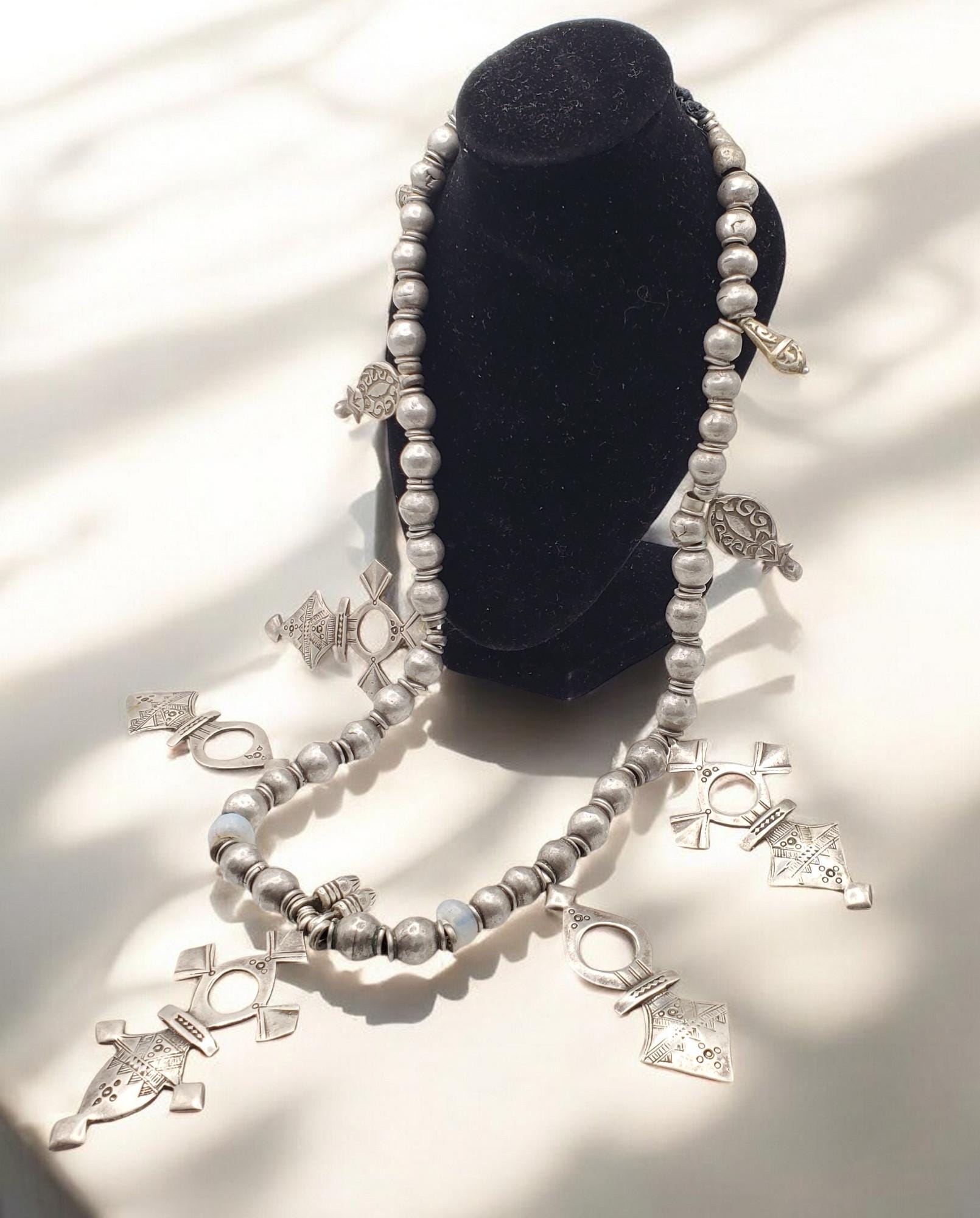 handmade silver Tuareg Necklace with Old 1960s silver beads the silver look much better than in the picc abut 3" x 1.5 long x 20" wide sterling silver 925 The Native people of North Africa are called Imazighen (Amazigh for singular), where we can find different dialects such as Kabyle, Tuareg, Chawi, Shelhi, Amazigh, Rifa, Mouza bit, etc. The Tuaregs refers then to the Amazigh/Berber people of the Sahara Desert Algeria, they are specialized in a lot of handcrafted artifacts such as leather products, Berber Rugs, and Silver Tuareg Jewlery with natural stones for hundreds of years. They excel in it all in keeping its traditional aspect, they are never mass produced, and they are never identical as they have always been handmade one by one. This piece it‘s in its original settings other shop......africanbazaarus.com