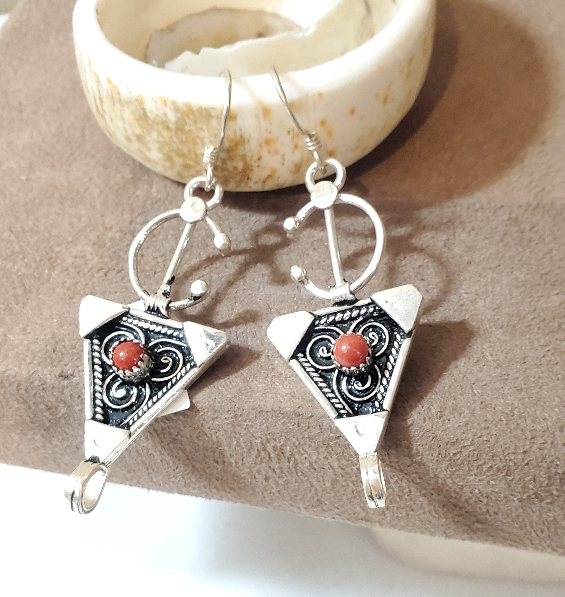 Moroccan Berber Dangle Earrings with enamels & Coral Sterling Silver red coral This is a great authentic jewelry from Morocco. Each earring measures just over 2.5" long and just under 1‘‘.5 wide./ 28.gr The workmanship is wonderful .These earrings were hand made sterling silver 925 new high-silver content if you have any questions - Feel free to contact me. . Thank you for visiting my shop All my jewelry has been collected over 20 years ago .I will be listing more pieces shortly as I am constantly always working on posting more. piece to add to the collection .I ship all over the world and price includes a tracking service.