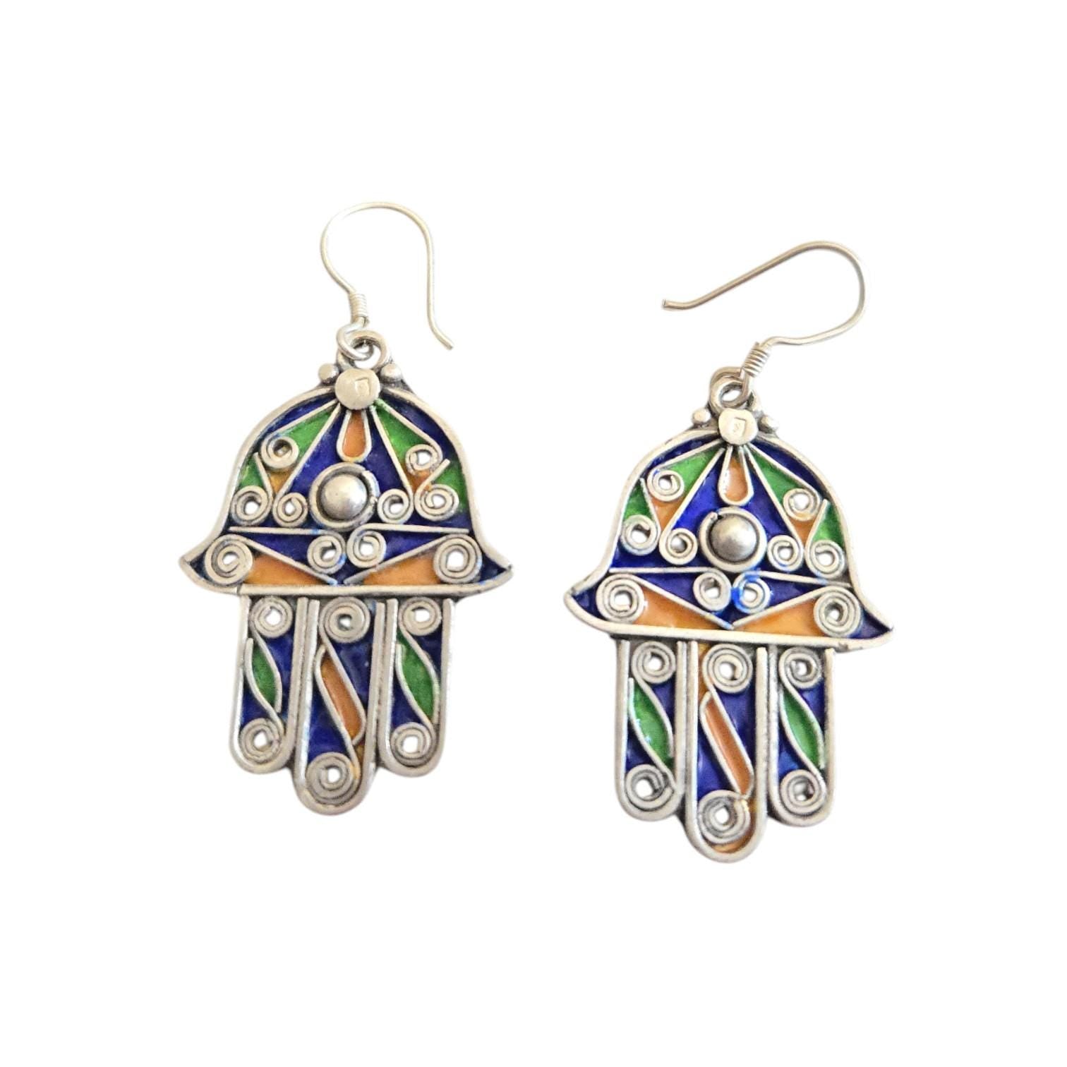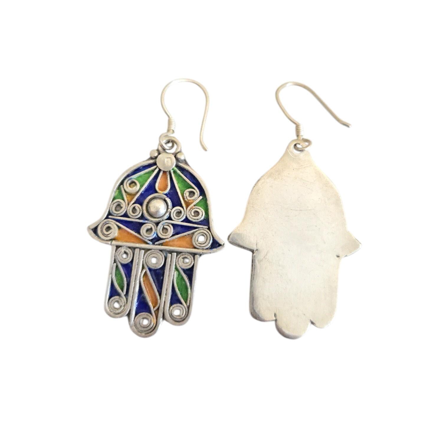 Moroccan Hamsa Enamel Earrings: Sterling Silver 925, Berber Tribal Jew