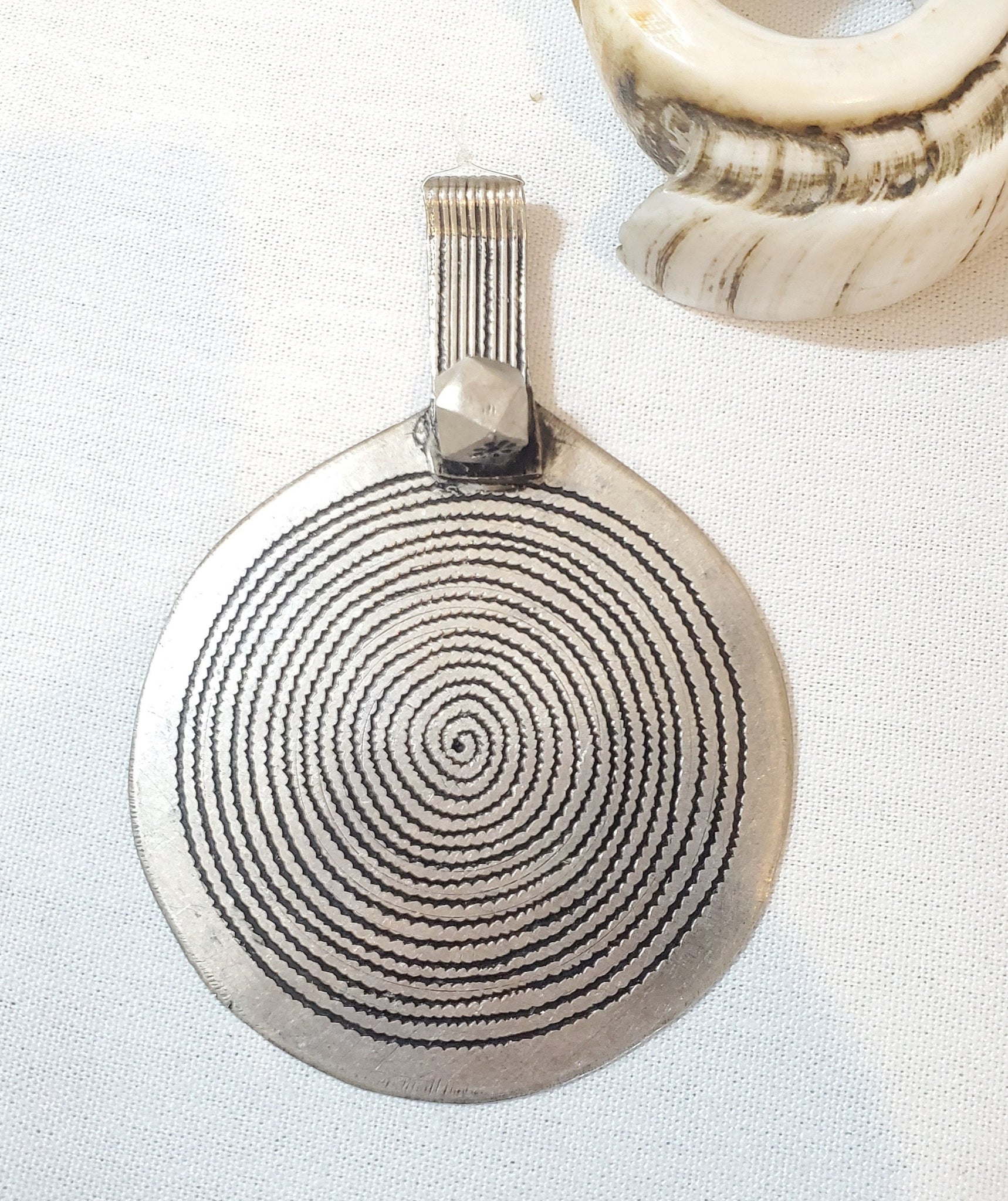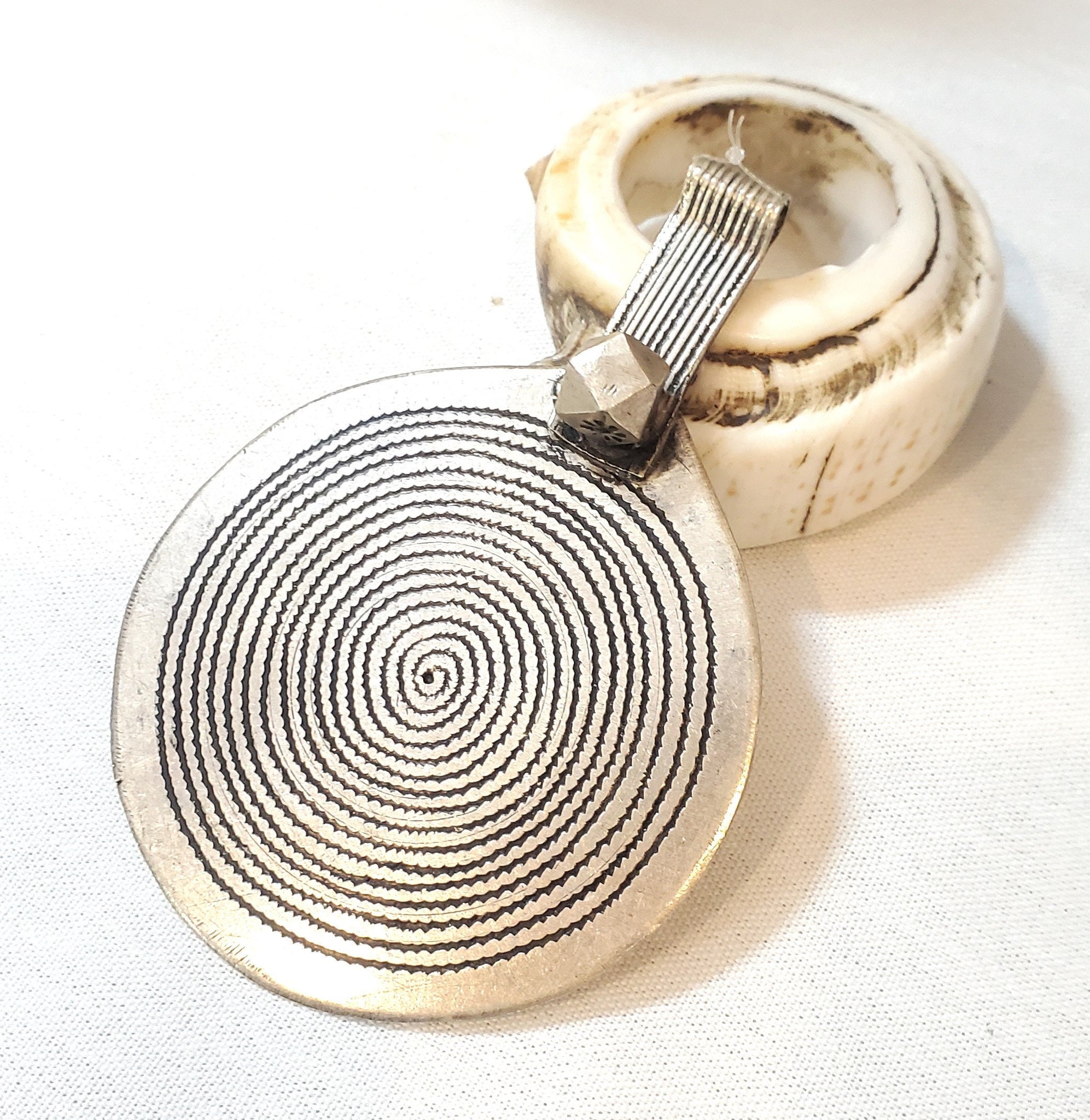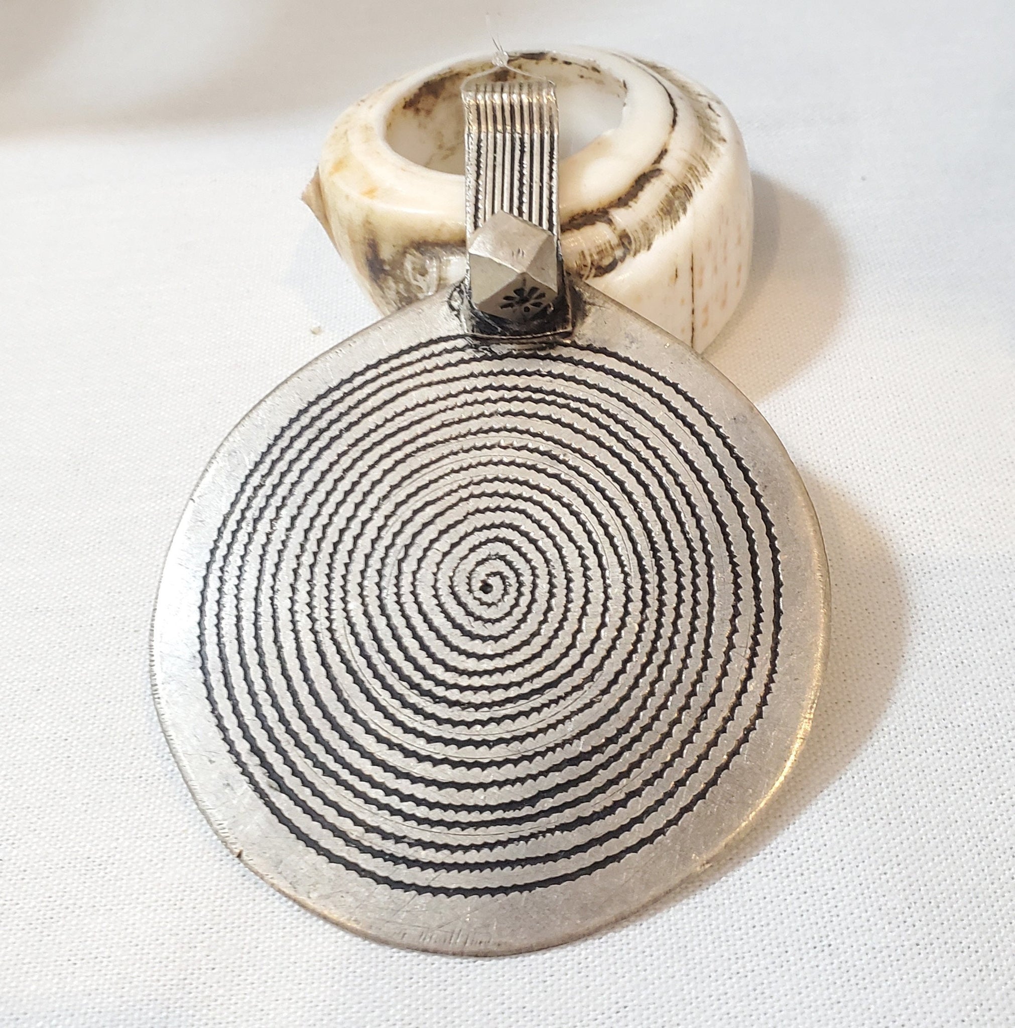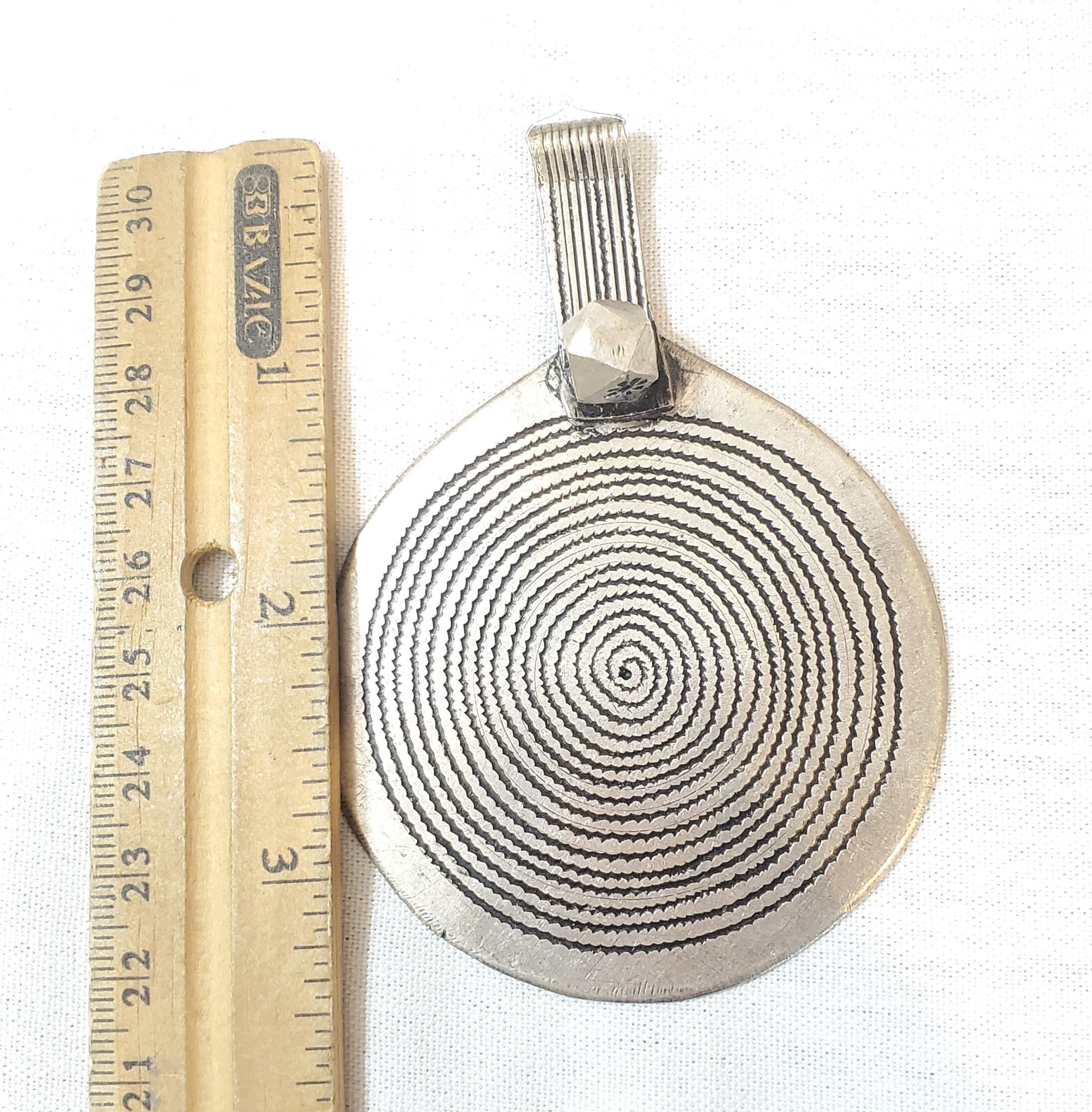Moroccan very Old traditional Berber spiral pendant is sterling silver, made in Morocco .This is a beautiful traditional style which is a symbol of the progress of life and the spiral of time. These are worn traditionally by Berber people all over the northern parts of Morocco. The piece is 2‘‘.5 wide by 3”.3 tall, with a wide loop for wearing on a chain or stringing onto a necklace. THIS IS great PENDANT 925 Silver if you have any questions - Feel free to contact me Good condition with no dents (see pictures). Collectible and useful as jewelry supplies.THANK YOU.......africanbazaarus.com
