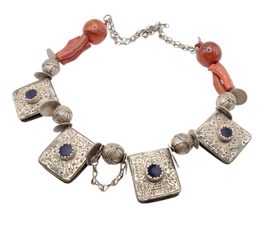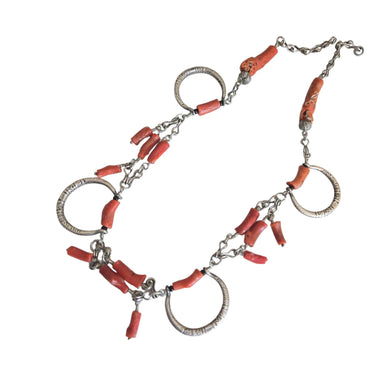 Antique Yemen Bawsani Coral Silver Necklace: Filigree Tribal Jewelry