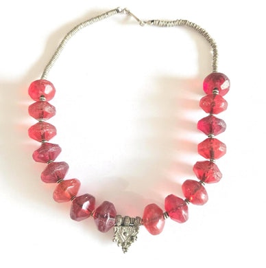 Old Ethiopian Silver Telsum Necklace: Red Vaseline Beads, Amulet Pendant