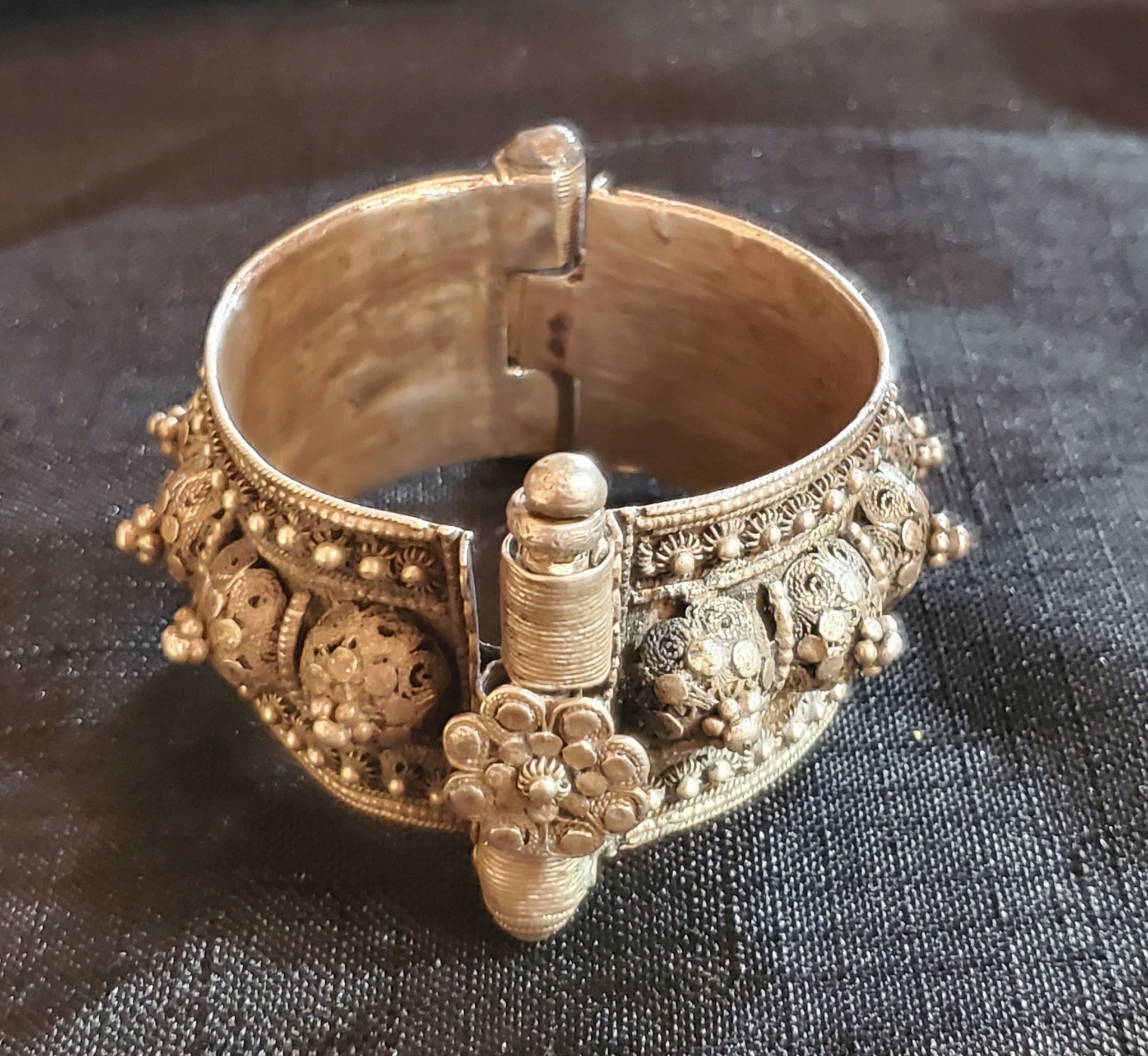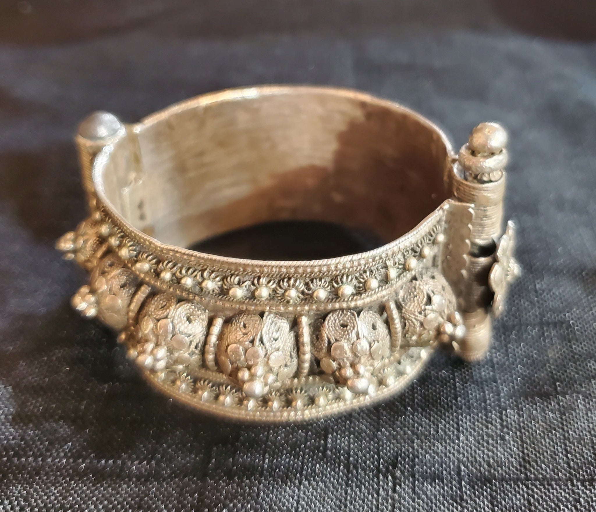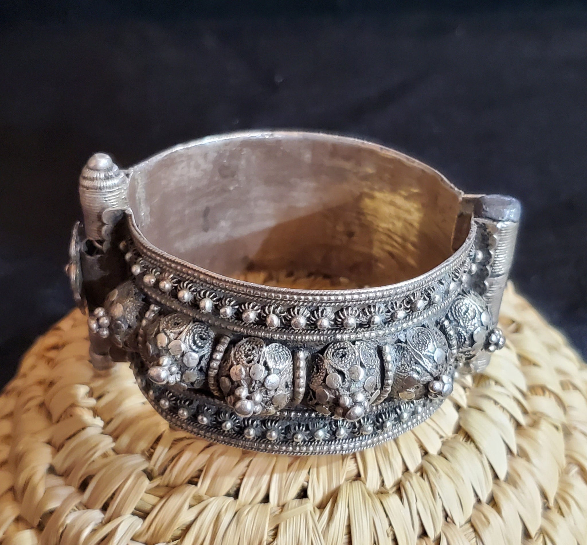 Yemen antique silver Bangle bracelet. Stunning, single Antique Bedouin bracelet well handmade piece, filigree work,high grade silver done by highly skilled silversmith really looks much better than the pictures Beautifully detailed and decorated made of good silver Wonderful to wear or highly collectable.. Lovely workmanship In good condition considering its age, 1920-30 It has It has a pen to open and close easily fit in good condition. It measures 3‘‘ x 2"in 7.cm diameter on the inner side This beautiful piece of silver was created for a Yemeni woman before the 1940s when the Jewish silversmiths emigrated to Israel. The jewelry became more and more valuable because there was no longer a way to have new pieces made, and that‘s why these bracelets are becoming rare This piece can be purchased on a lay-away plan that works for you Contact me for more information.Thanks for your support and feel free ...africanbazaarus.com